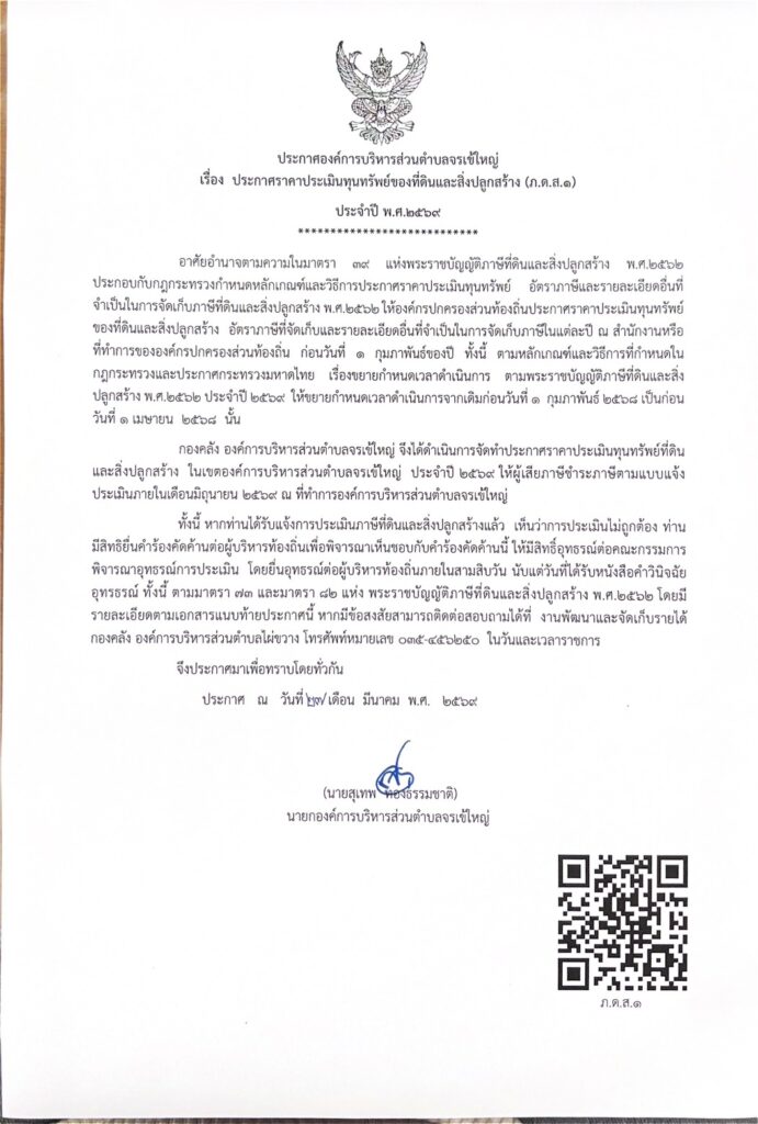 ข่าวประชาสัมพันธ์ ประกาศองค์การบริหารส่วนตำบลจรเข้ใหญ่ เรื่อง ประกาศราคาประเมินทุนทรัพย์ของที่ดินและสิ่งปลูกสร้าง (ภ.ด.ส.1) ประจำปี พ.ศ. 2569 สำนักงานปลัด องค์การบริหารส่วนตำบลจรเข้ใหญ่ มี.ค. 27, 2026